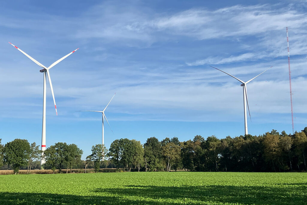 In Glane haben wir mit unserem Kooperationspartner VR Energieprojekte GmbH einen Windpark mit sieben ENERCON E-160 EP5 E3 auf 166,6 m Nabenhöhe und jeweils 5,56 Megawatt errichtet. Alle Windenergieanlagen sind seit dem 28. August 2023 im Betrieb.